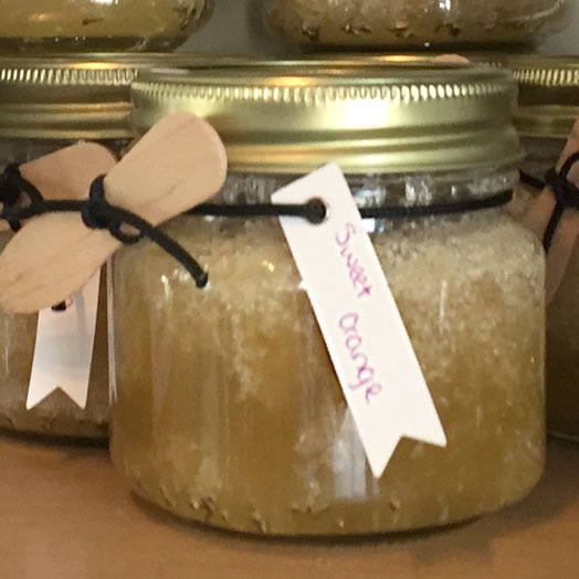 pure can sugar, extra virgin olive oil, and sweet orange essential oil
